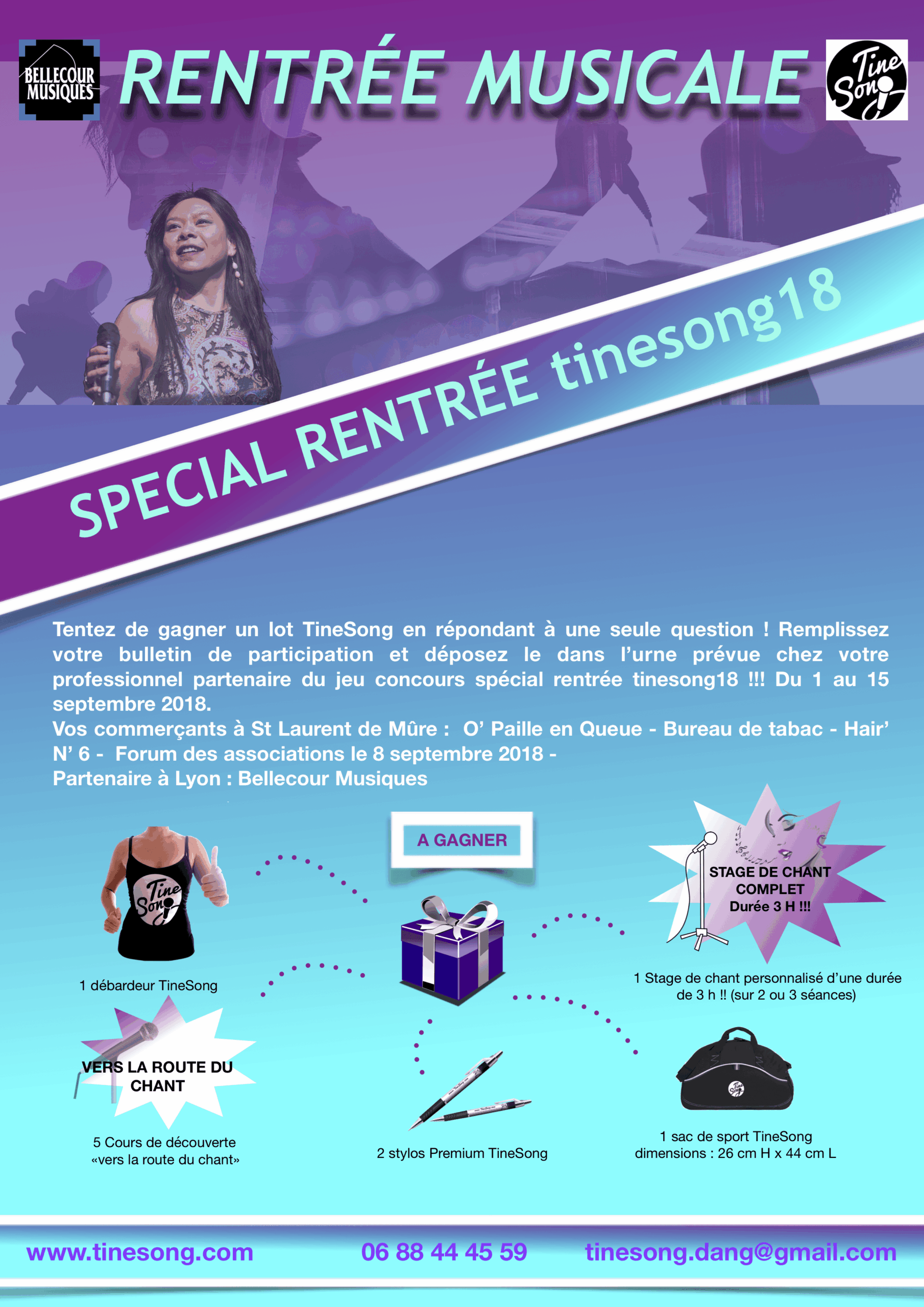 Résultat du jeu : journée pédagogique TineSong 2018 Nom du gagnant : Clara Fiancette Félicitations !!!! Vidéo Youtube : https://youtu.be/G5Oxcor2fhY